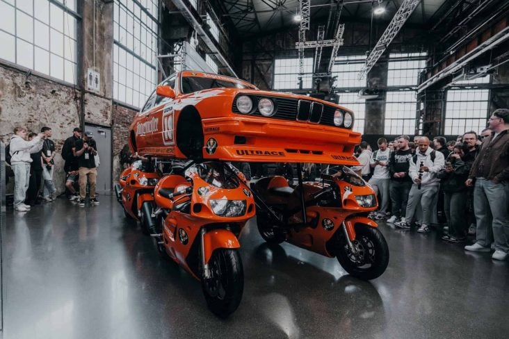 Em uma das principais feiras de modificação automotiva do mundo, realizada em Düsseldorf, na Alemanha, expositores poloneses apresentaram uma construção que desafia a lógica convencional: um BMW M3 de primeira geração cujas rodas foram substituídas por quatro motocicletas Suzuki GSX-R.
